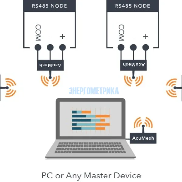 Решение AcuMesh предназначено для беспроводной передачи данных со счётчиков или иных устройств, оснащённых RS485, на ПК. Это экономичное решение позволяет обойтись без дополнительнительных соединительных проводов.
