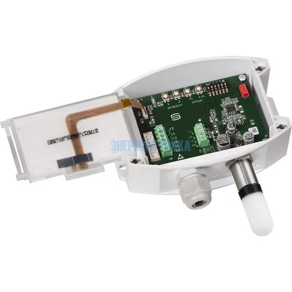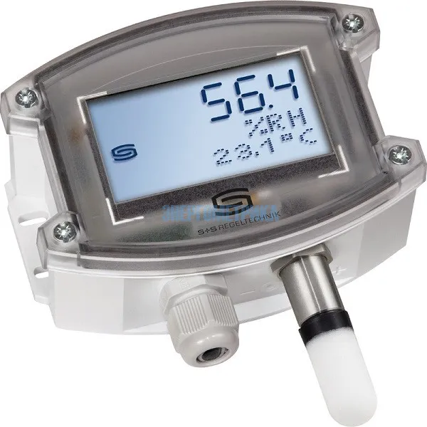 Измерительный элемент в виде цифрового влагостойкого датчика, защищенного пластиковым мембранным фильтром, позволяет определять относительную влажность в диапазоне 0…100 % с точностью ± 3% в каждом из четырех переключаемых температурных диапазонов. Результаты измерений преобразовываются в линейный сигнал 4...20 мА или 0–10 В.