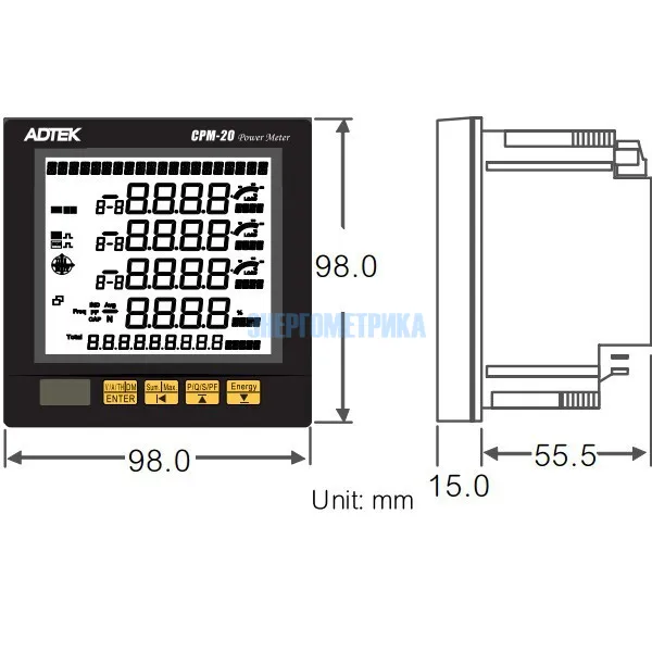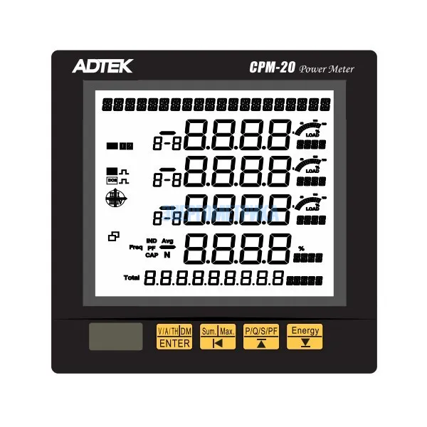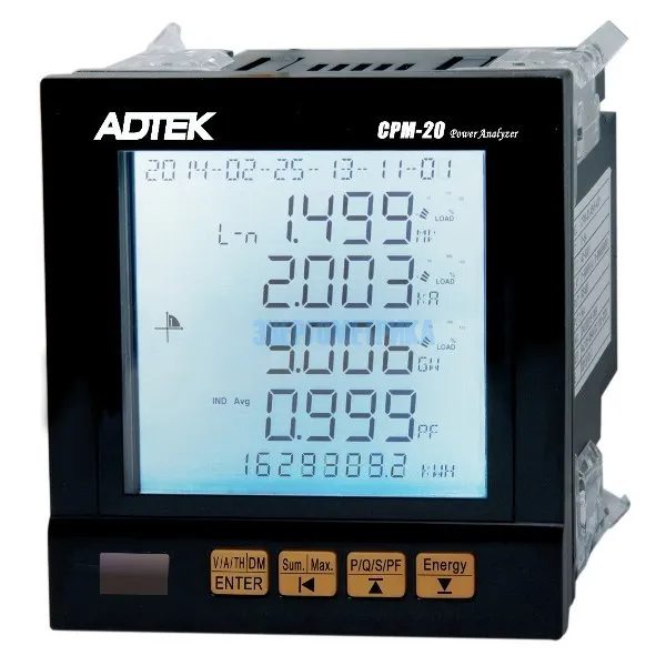 Позволяет выводить измеряемые параметры на дисплей. Также на экране отображается сведения о потребляемой электроэнергии и качестве энергии. Данные передаются с помощью встроенного коммуникационного порта RS485 Modbus. СРМ-20 многофункциональный измеритель мощности соответствует стандартам FCC и СЕ.