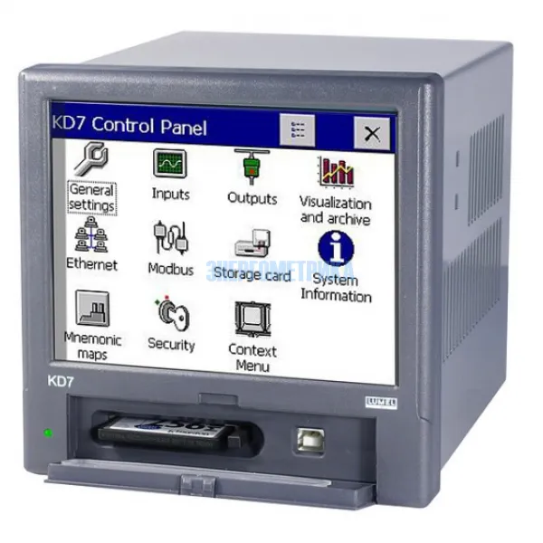 Электронный регистратор KD7 также можно использовать как автономное измерительное и записывающее устройство. KD7 применяется для измерения изменений напряжения, тока, температуры, сопротивления и других величин, преобразующихся в сигнал или электрический параметр. Источником данных измерения могут также быть интерфейсы связи (ETHERNET, RS-485).
