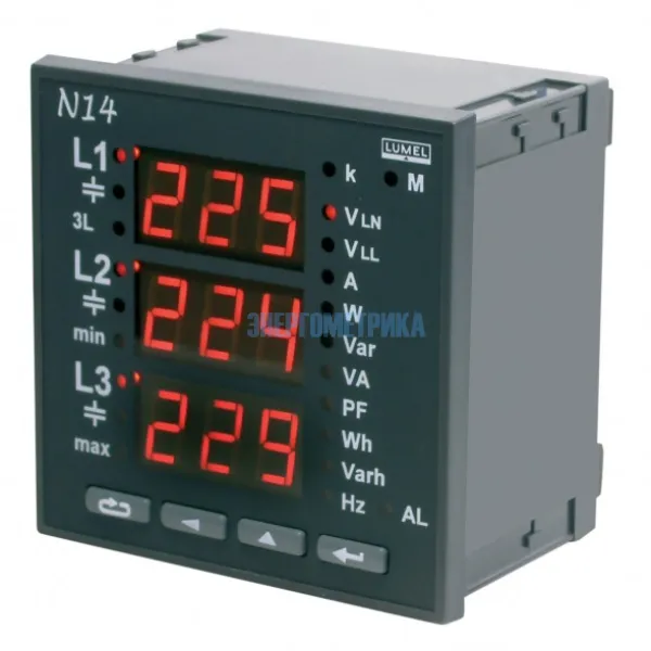 Анализатор энергопотребления N14 Lumel может использоваться в сетях сбора данных или в качестве одного измерительного прибора вместо многих различных измерительных приборов, используемых до сегодняшнего дня: амперметров, вольтметров, ваттметров, варметров, фазо- и частотомеров и других.