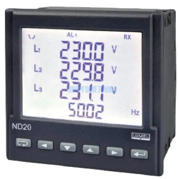Анализатор параметров электрической сети ND20 позволяет контролировать и оптимизировать силовые электрические приборы, системы и промышленные установки. Прибор обеспечивает измерение: частоты, среднеквадратичных значений тока и напряжения, активной, реактивной и полной мощности и др. параметров. Напряжение и ток умножаются на заданные коэффициенты измерительных преобразователей. Значение каждой измеренной величины может быть передано в управляющую систему через интерфейс RS-485.