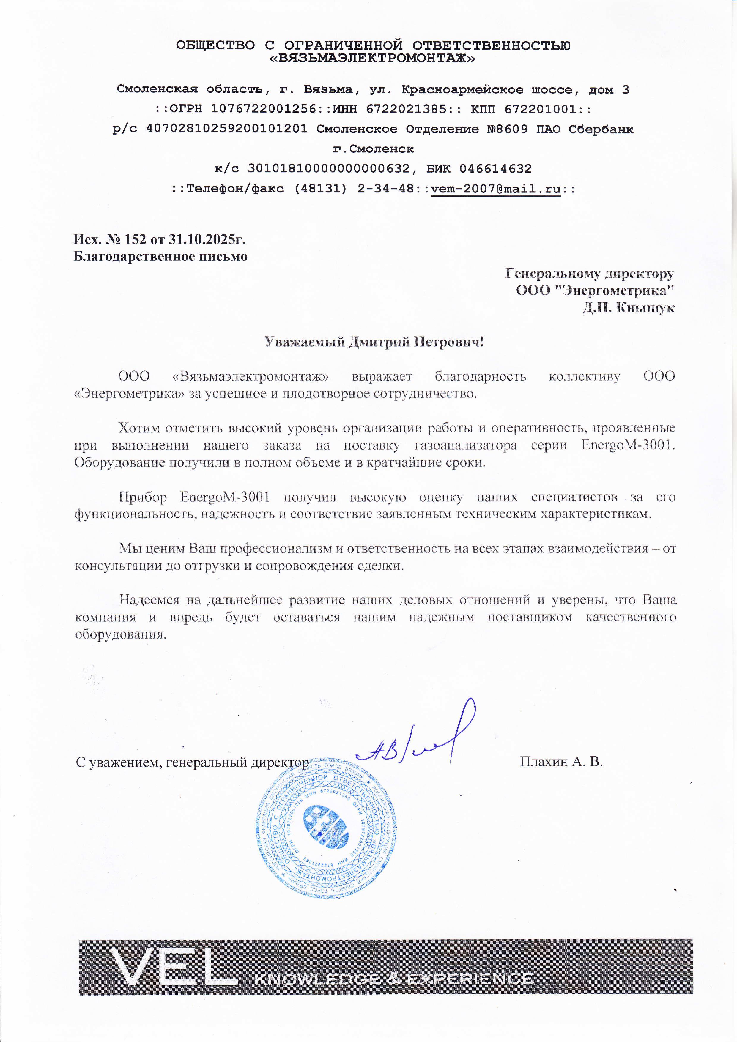 ООО «ВязьмаЭлектромонтаж» выражает благодарность коллективу ООО «Энергометрики» за успешное и плодотворное сотрудничество.