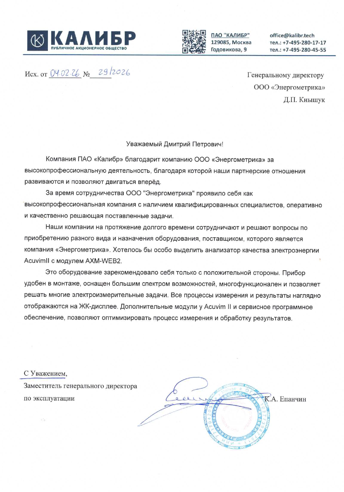 Компания ПАО «Калибр» благодарит компанию ООО «Энергометрика» за высокопрофессиональную деятельность, благодаря которой наши партнерские развиваются и позволяют двигаться вперед.