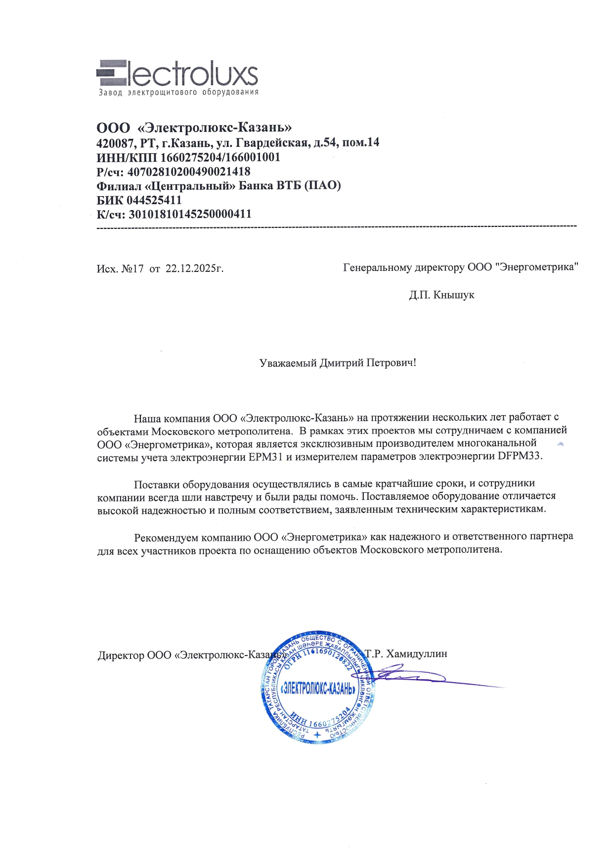 Выражаем благодарность компании ООО «Энергометрика» за высокий профессионализм и своевременно осуществленную поставку в полном объеме.